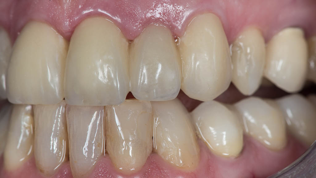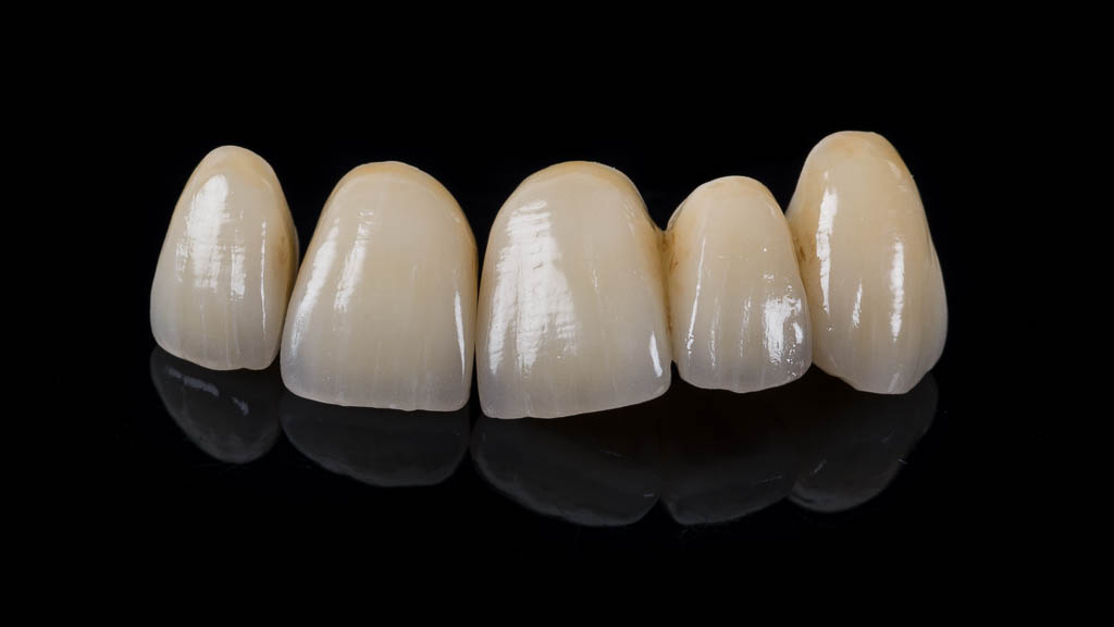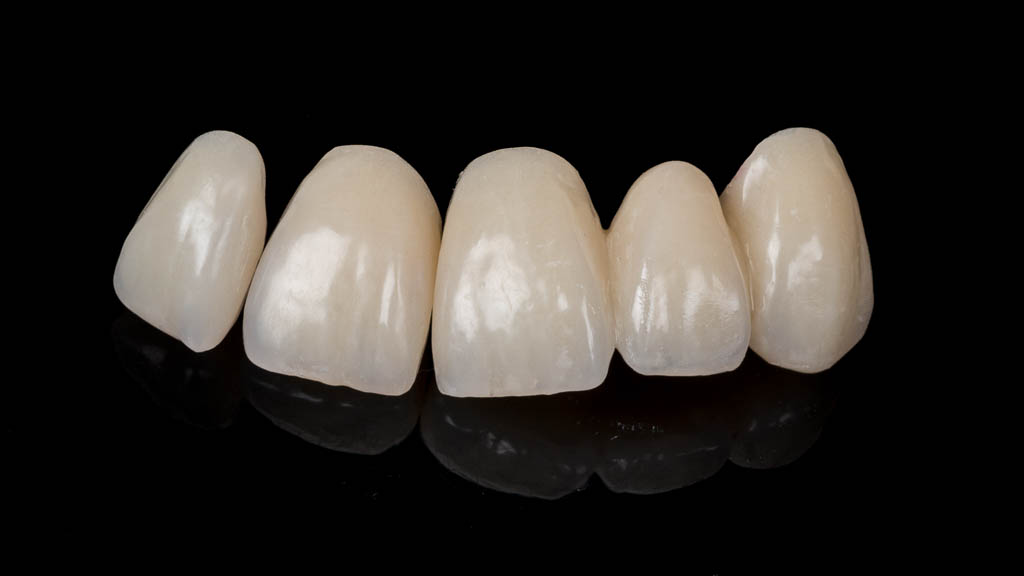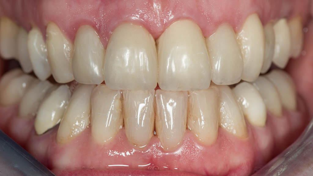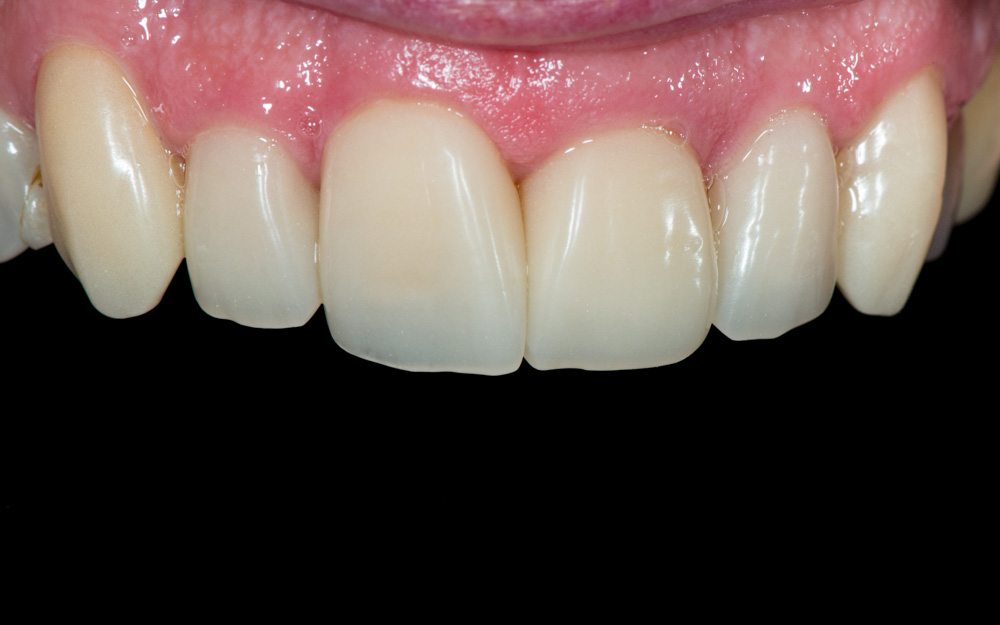Die fertige Zirkonbrücke in Bezug zu dem Zahnfleisch.