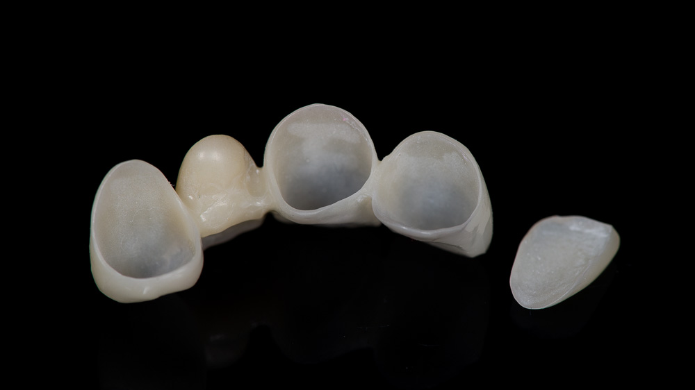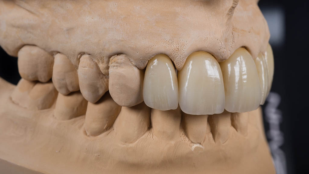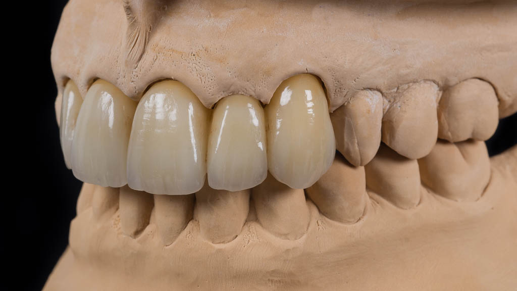 Die fertige Versorgung - Zirkonbrücke. Das Zwischenglied ist so gestaltet, dass der basale Anteil aus hochglanzpoliertem Zirkon besteht.