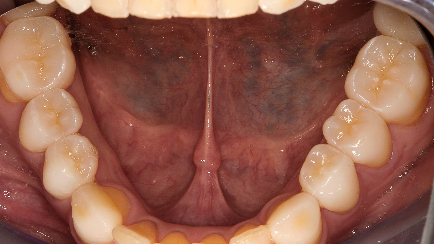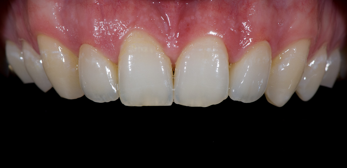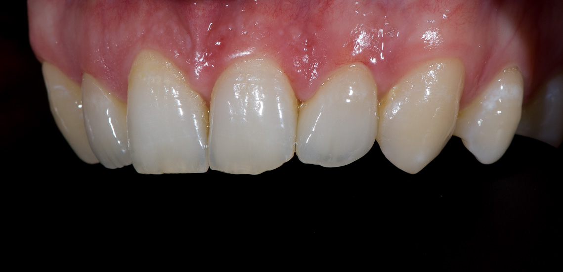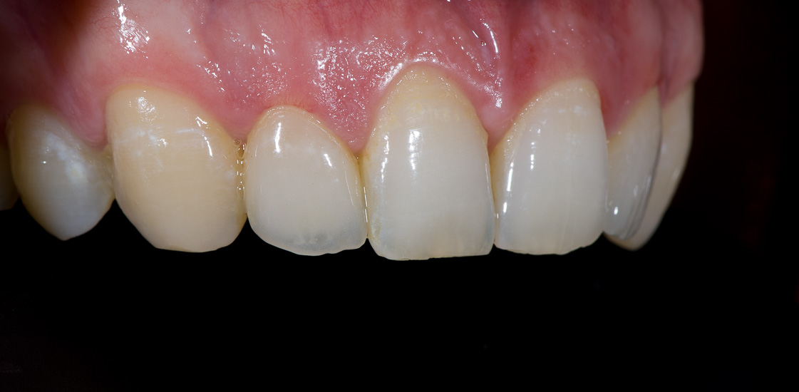Der unpräparierte Eckzahn erhält ein kleines Non-präp Veneer um die Lücke zum seitlichen kleine Schneidezahn zu schließen. Das Additional Veneer wird verklebt, anschließend finiert und bildet danach eine sichere und feste Einheit mit dem natürlichen Zahn.