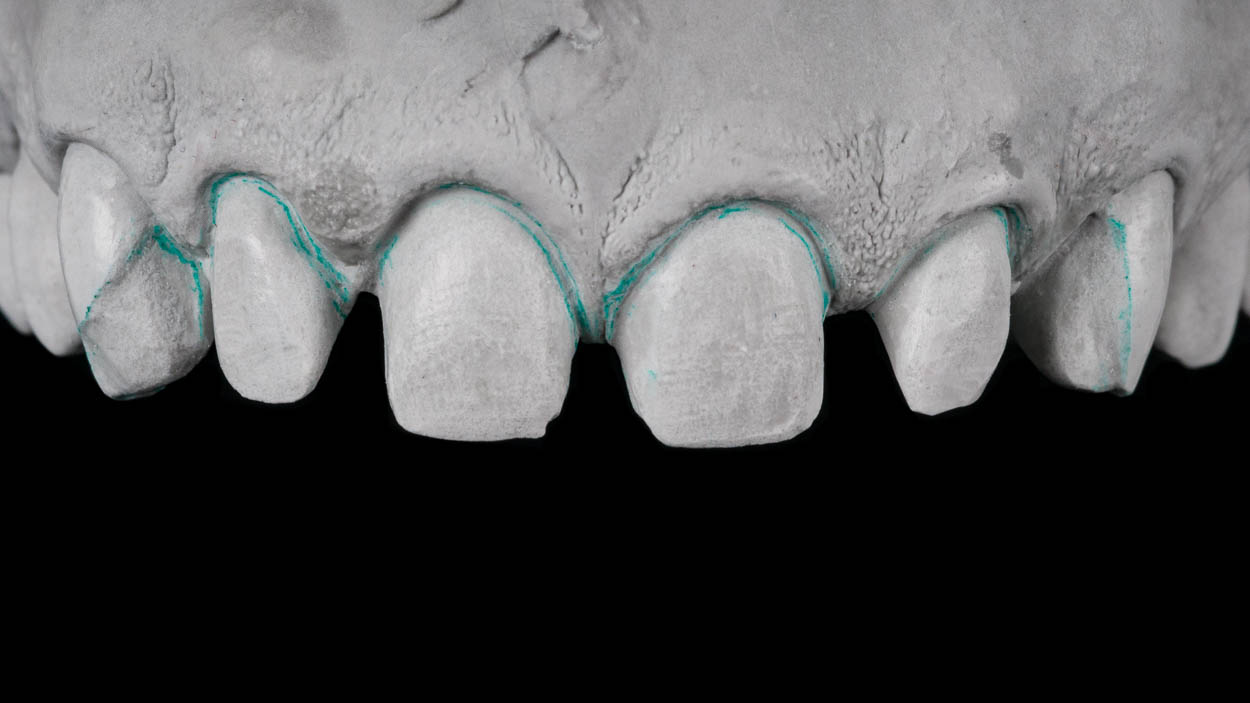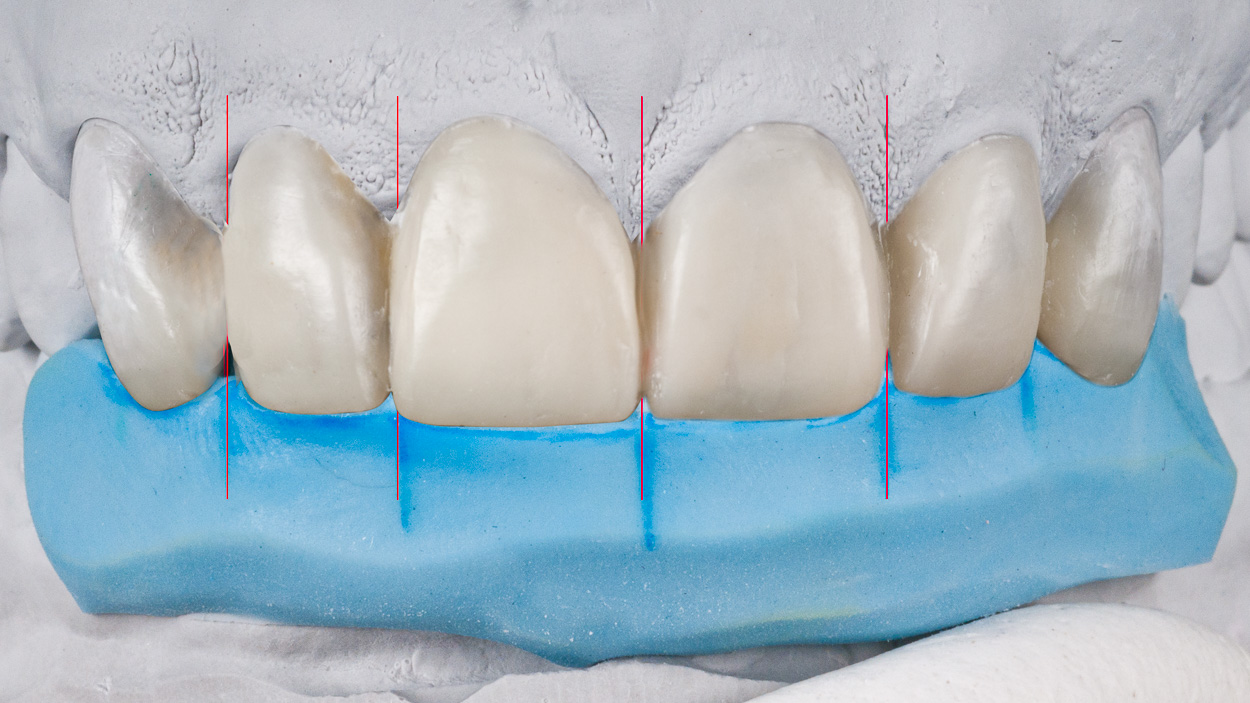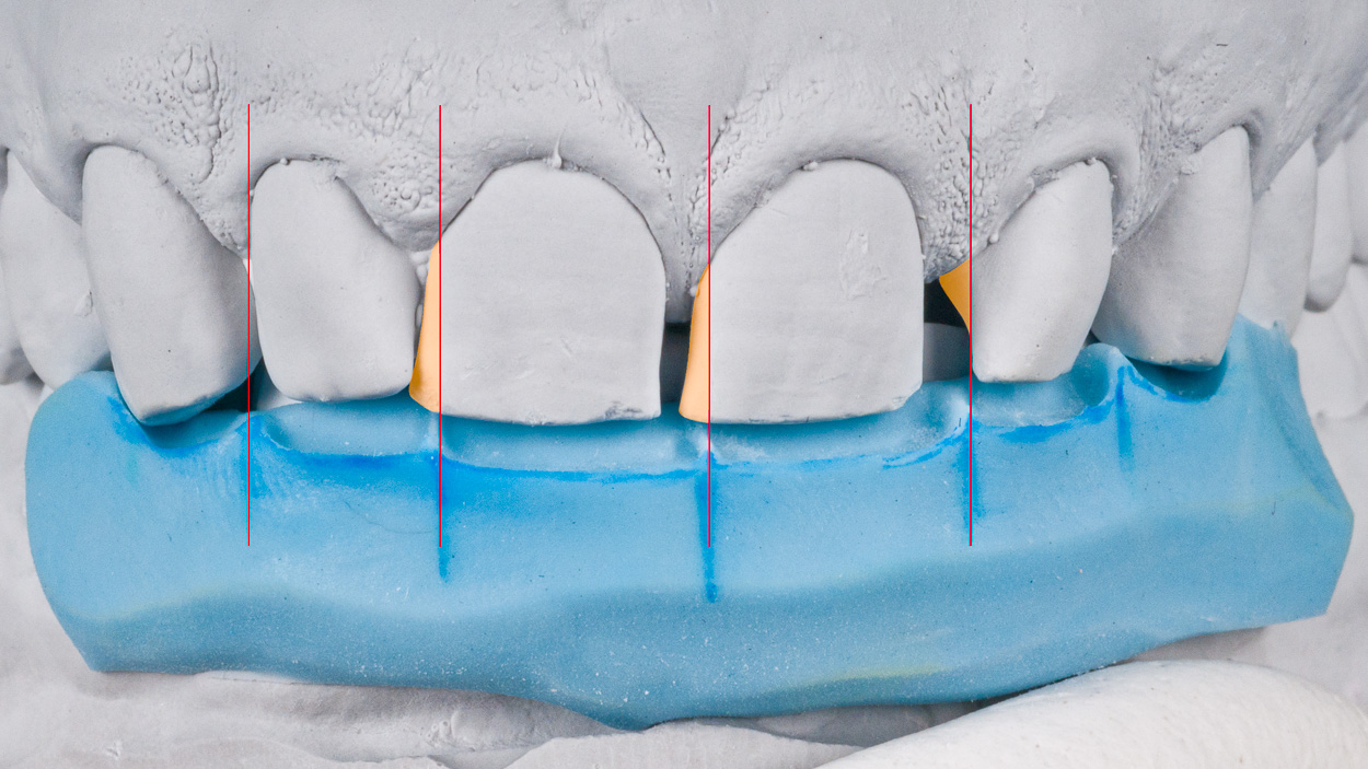 Vor dem Beginn der Präparation werden auf dem Situationsmodell, mittels Wachs, die zukünftigen Zähne geplant. Die entsprechend nach dem Modell hergestellten Schablonen geben bei der späteren Präparation wichtige Hinweise.