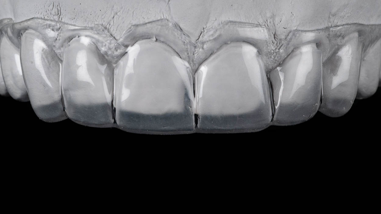 Zur Kontrolle der Präparation werden im Labor Tiefziehfolien über die neu geplante Form der Zähne gezogen. Mithilfe dieser glasklaren, weichen Folien kann der Zahnarzt*ärztin dann die Präparation im Mund kontrollieren.